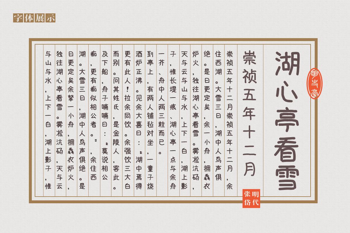 这款字体相对于一般的行书,减少了行书的棱角,增多了类似于圆体字体的圆角设计。 从这款字体的预览图中我们就可以发现,并不是只有圆角设计是最大的亮点,另外,那一笔一划的笔触也增添了字体的朴实感。