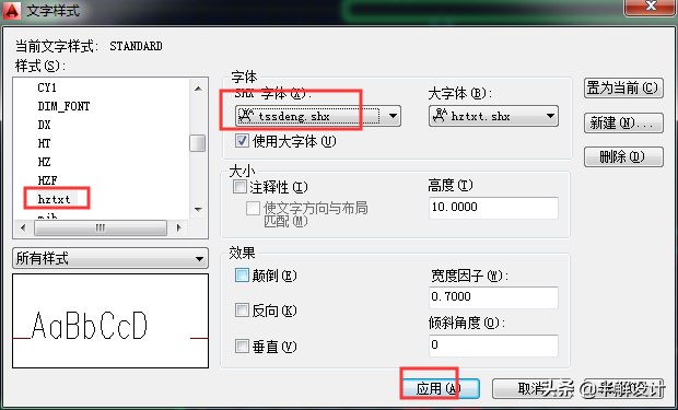 “ST”命令打开文字样式面板,样式栏中找到文字样式,SHX字体中选择我们需要的tssdeng.shx字体,点应用退出。(试了另外tssdeng2.shx字体,为空心字)