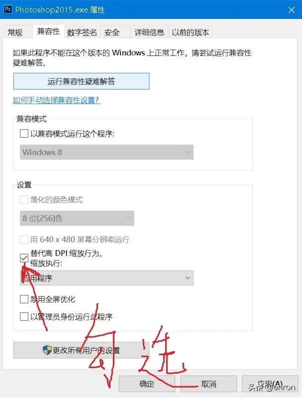4、右键,属性,兼容性,选替代高dpi缩放行为 ,下面记得选系统