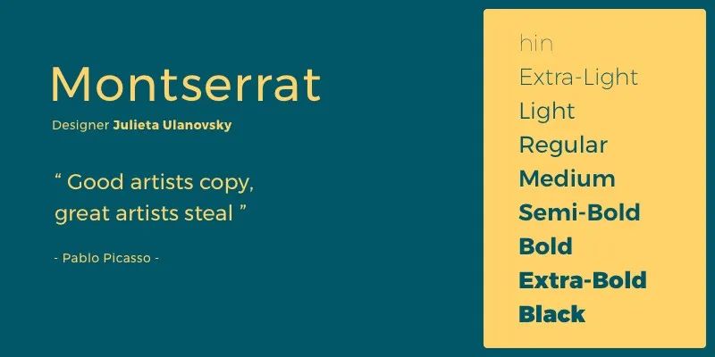 受几何无衬线字体风格的启发,Montserrat字体提供了现代、干净的字符设计。有18种风格,从薄到黑色,它迎合了广泛的极简主义设计,无论是不显眼的正文还是大胆的标题。