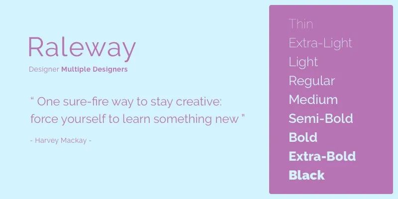 其独特的“w”和“k”字符强调了Raleway的优雅和成熟,在不影响可读性的情况下增加了视觉兴趣。 这种字体有九种粗细,其特色在于笔画的设计非常纤细,重量中等轻,宽度半伸展,是一款比较有个性和创意的字体,特别适合于极简主义设计中的标题和大文本。