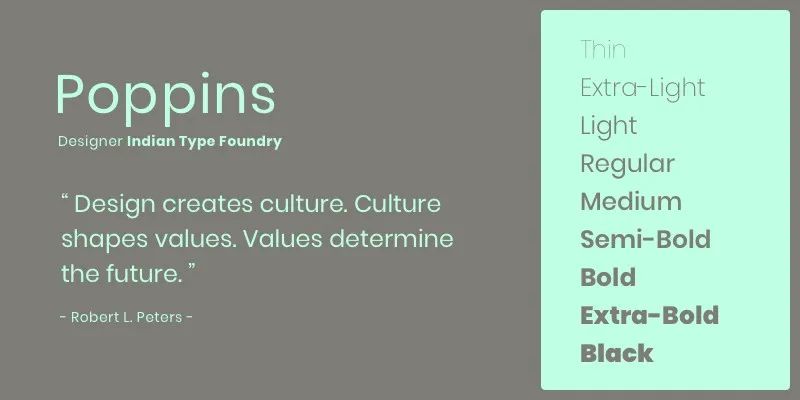 凭借几何无衬线设计,Poppins字体散发出一种干净、现代的美感。其平衡的字体,可在九种重量,支持高可读性在大尺寸和小尺寸,使其成为任何极简主义设计工具包的多功能添加。