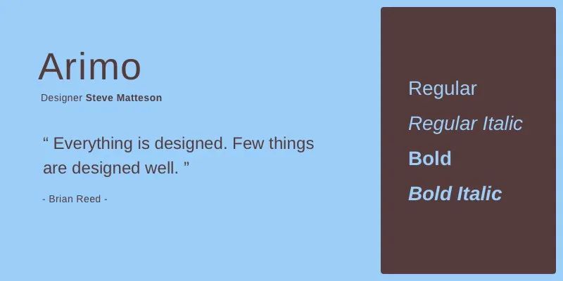 由史蒂夫·马特森(Steve mattson)设计的Arimo,其简洁的无衬线设计给人一种清新的感觉。它具有增强的屏幕可读性特征,使其成为跨平台文档可移植性的绝佳选择。