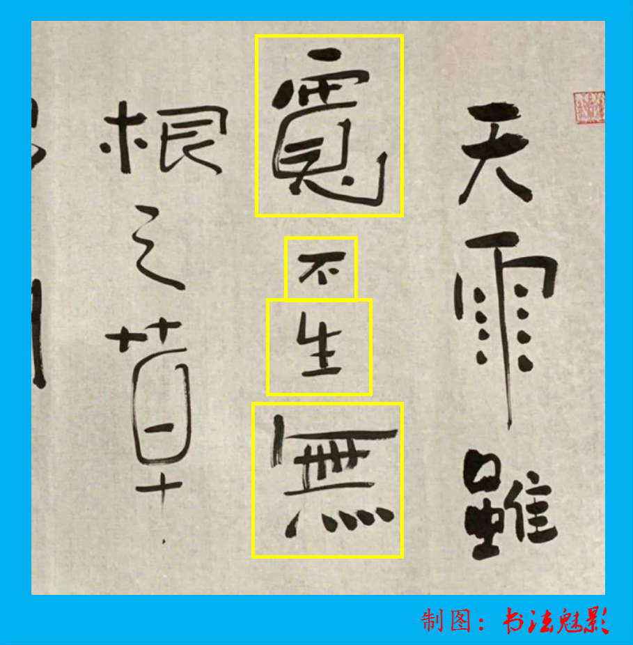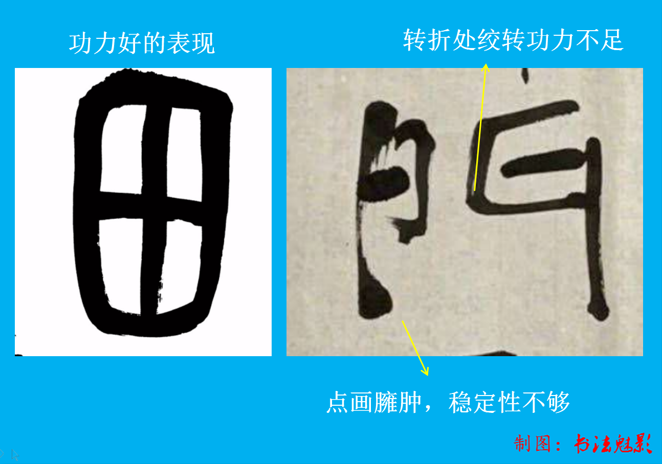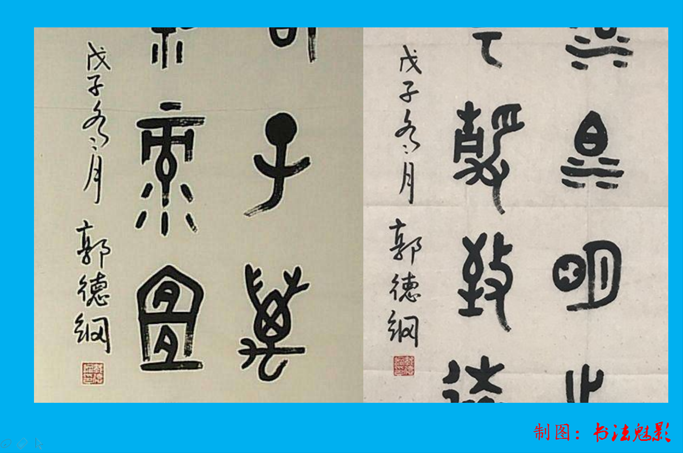 左边的字中锋厚实,而且转折之处功力十足,右边郭德纲写的明显练习少了,他在写转折的时候应该是停顿了一下,然后转动笔杆继续写,而流畅的篆书转笔是不需要停顿的,直接通过绞转笔锋或者迅速转笔杆顺势书写。所以他在篆书用笔上欠缺功夫,书法基础不够扎实。整篇作品的用笔是一个大问题,即使结构章法自然天趣,基础不牢,地动山摇,还是不能入专业行列,仅仅是一名普通的书法爱好者。