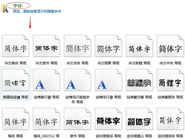 步骤三:接着找到“字体”双击打开,当打开字体面板的时候,我们就会看到里面有很多系统自带的或者我们以前安装过的字体,这里就是存储安装的字体的位置。如图: