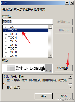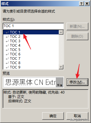 ·首先打开样式对话框,在目录一上右键单击修改。这里可以设置目录一的字体名称、字体大小,同样的目录二也是这样的操作。