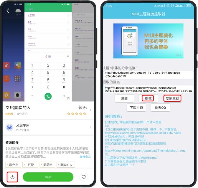 打开个性主题,选择喜欢的字体,点击左下角分享,选择分享至便签或者我的电脑,主要目的获得该字体的主题链接。复制主题链接,打开“MIUI主题直链提取器”粘贴主题链接,点击“提取”,再点击“复制直链”。