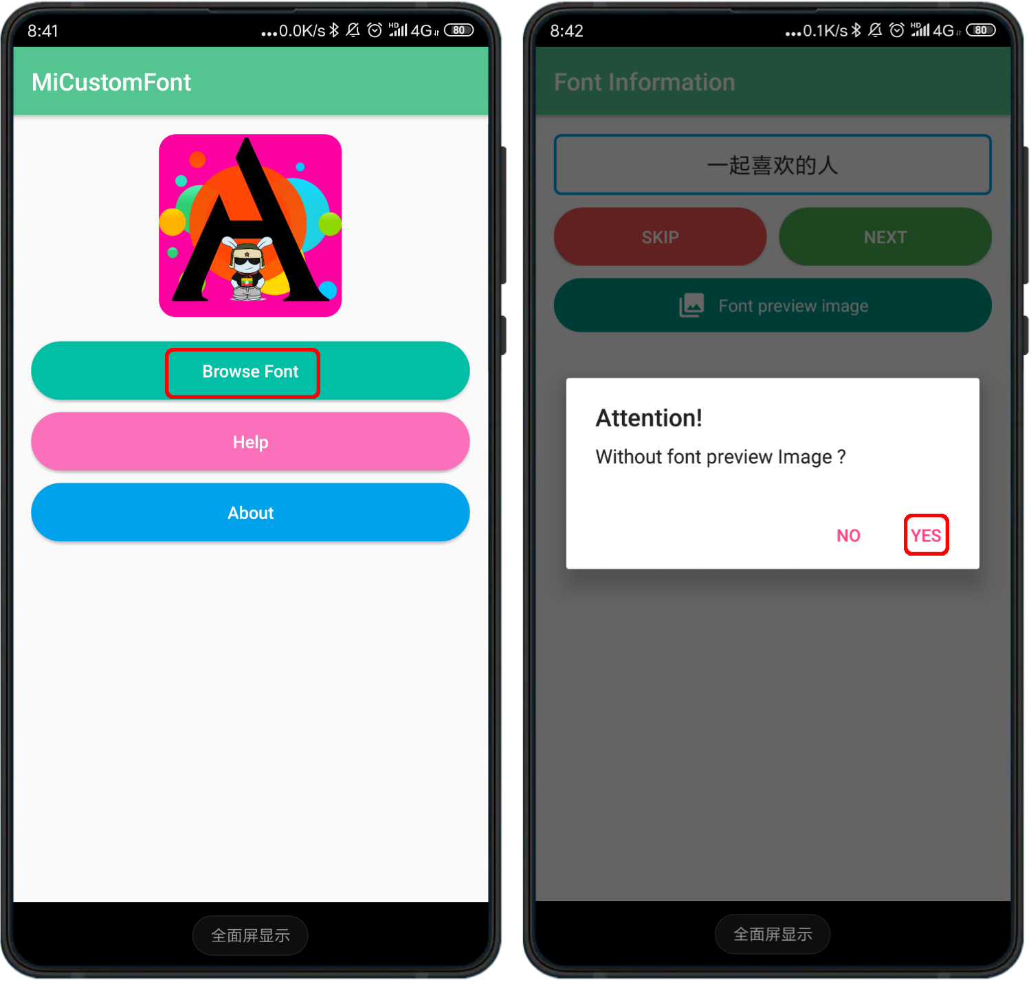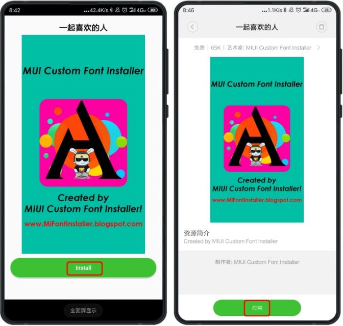 主题名称输入完毕后,点击绿色“NEXT”按钮进入下一步,再点击“Install”安装主题。安装完成后,打开个性主题,点击右下角“我”字标签进入个人中心,再点击“字体”即可看到我们破解的字体主题,点击应用重启手机即可。