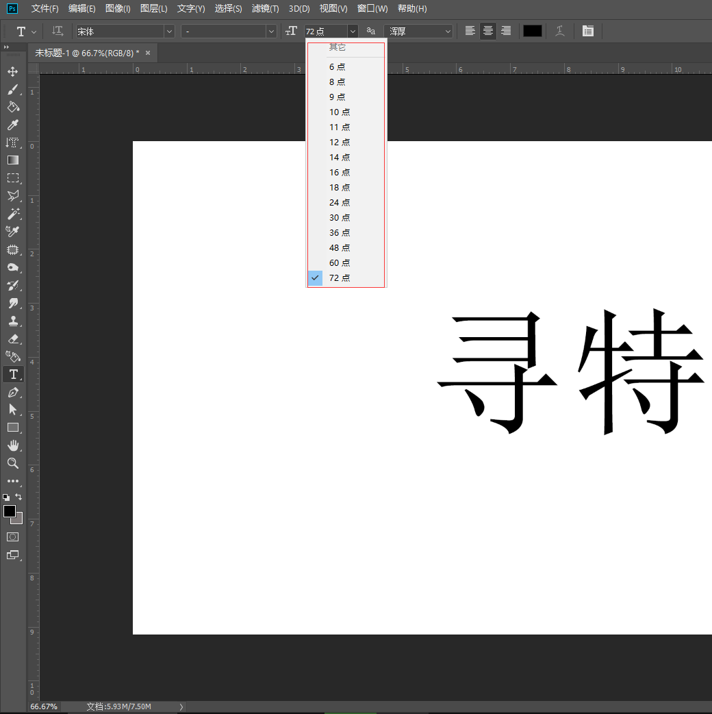 1.新建背景层,输入文字,调节字体大小。调节最大字体也只能到72,得到如图大小文字