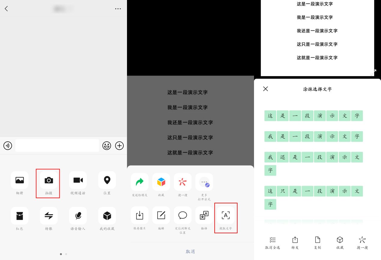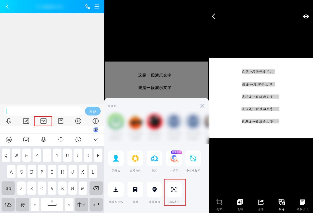 最后要分享的软件也是一款大家非常熟悉的社交软件——“QQ”,它的操作方法和前一款社交软件几乎一致,也是在软件内拍摄图片后,将其发送到任一聊天框。然后我们再点开图片,长按后选择【提取文字】便可以了。