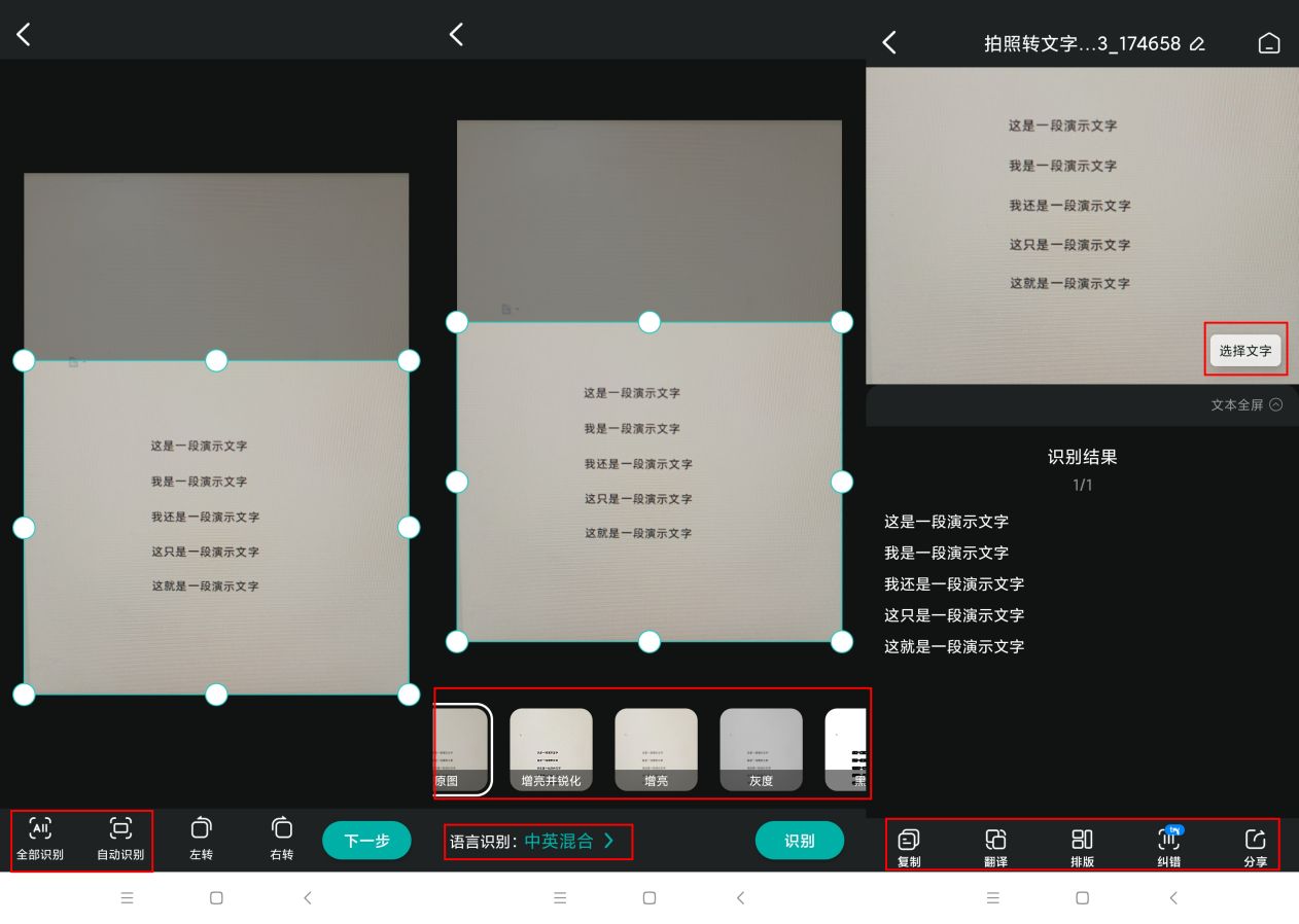 它的拍照识别文字功能非常有趣,内置了【增亮】、【灰度】等多种可以增加图片清晰度的滤镜,我们可以选择合适的滤镜,使图片文字的识别结果更为准确。它支持识别多种语言,将文字识别后,我们可以自由选择复制,如果有翻译的需求也可以在这里一并实现,十分方便快捷。