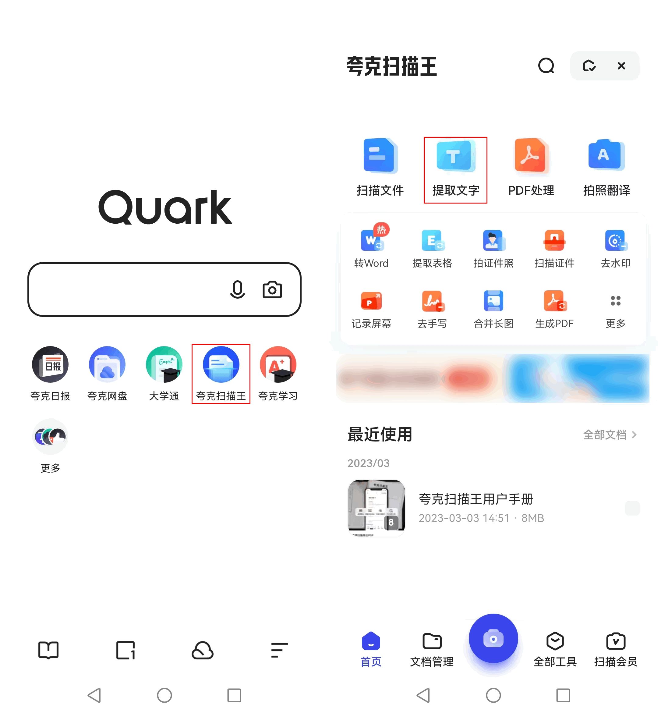 第一步:在浏览器的第一页,点击“夸克扫描王”,接着选择“提取文字”。