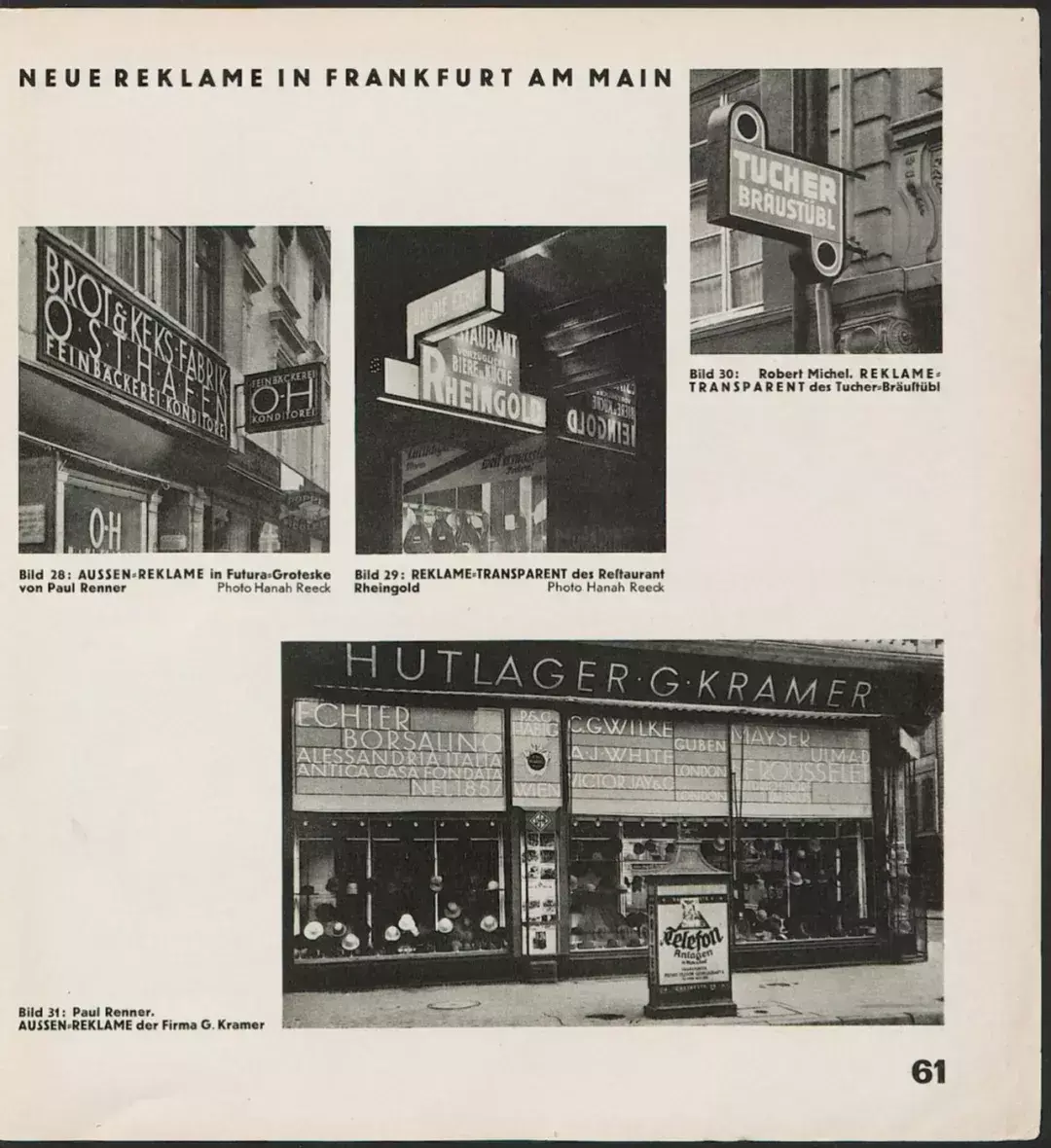 在‘Werkkatalog’ 中,这张字母设计稿的背面标有1925年。图5左边的标有1952年的字体并不被认为是原始版本,它是由Kramer设计的。随着开始对Kramer的字体进行讨论,右边的字体设计样稿也与大多数出版物所认为的属于Kramer设计的字体有所不同。例如Baseline出版社(Chistopher Burke所写的“Futura的创造者”)以及其他许多出版社,都将图1的设计样稿认作是这一张。我觉得,来自‘Werkkatalog’的这张设计样稿之所以会简单的被认为是属于Kramer的,只不过因为它是从kramer的档案中找到的。但是我个人却认为,这仅仅只是一张对Renner为法兰克福城市建设部门所设计的字体的拷贝文件或原文件的附件。这上面的字体造型与1925年Bauer字体铸造厂发布的Futura试用版有好几处明显的不同(例如字母J与S),其中的大写字母可能是Renner为一些建筑用字所做的设计尝试。1927年一月号的‘Das Neue Frankfurt(新法兰克福)’杂志(图6)上刊载了Kramer的父母在法兰克福所经营的一家帽子店,其门头使用了Futura字体。而刊登有这些图片的几页上均标出设计属于Renner,而且字体的名称(Futura-Groteske)也在另一页上标示了出来。部分被更换的字母则是招牌制造商们根据Renner的设计稿所制作的。那还是一个没有电脑、扫描仪或者打印机的年代。