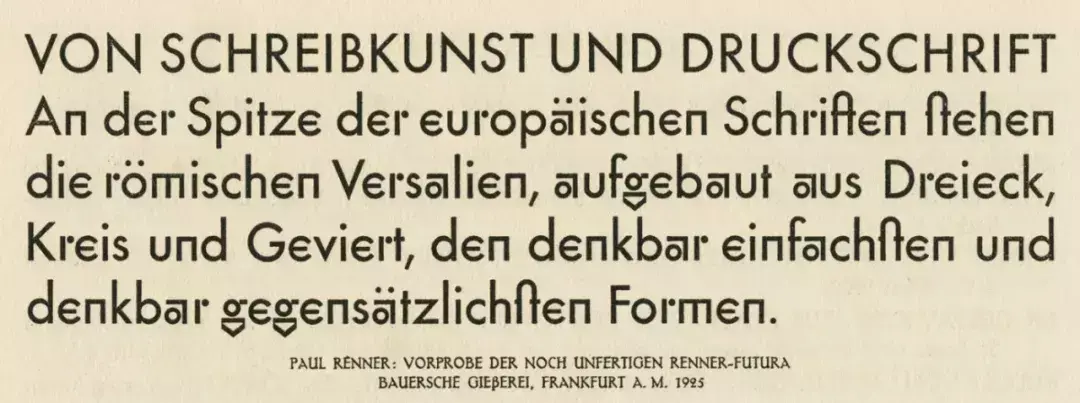 要知道,在那个年代,制作一本书通常需要花费数月的时间(从概念的成形到最终印刷)。在一部Renner出版于1940年的书中,他报道了关于1925年在科隆与门兴格拉德巴赫举办的大型印刷公司交流会中,由Bauer字体铸造厂所展示的Futura字体。