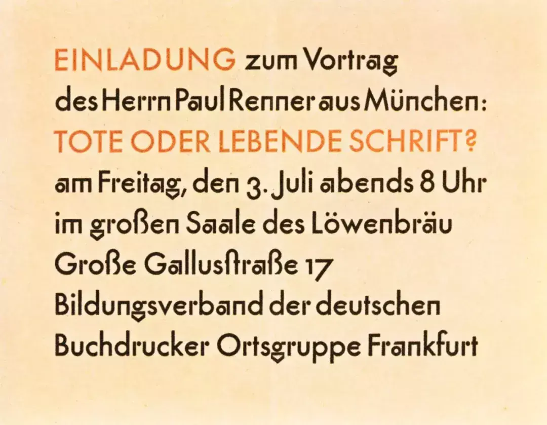 这张设计草稿图(图1)中的黑色字母奠定了Futura字体大写字母的形式,而那些轮廓图则验证Megaw在文章中所提到的1924年时关于A与K的设计。另有一张标记日期为1925年7月3日的某演讲邀请函(图3),则使用了Bauer字体铸造厂的试用版Futura字模印制而成。可以看到在这里的大写字母的造型,是介于Megaw文章中所提到的初版Futura与最终版之间的一种形式。