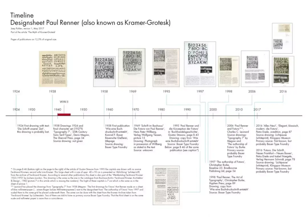 自2016年以来的近期出版物,书籍‘Futura. Die Schrift’和 ‘Alles Neu!’出版社都讨论了图1的那份设计样稿。如此多的字体样本与采用Futura字体印刷的实物构成了一场视觉盛宴。但是发生了一些奇怪的事情,在Emcke的‘Futura. Die Schrift’中,将试用版的Futura字体标记为1926/27年,即使图片上清清楚楚的写着1925年7月9日。而同样的,这份1958年首次出版的设计稿明明归属于Renner,突然间又被张冠李戴,成了Kramer的。Katherina Pennoyer所写的一篇文章的副标题是“依然未知的真相与细节”,根据她所给出的一些细节,将Kramer推为了Futura字体设计灵感的功臣。她又再次提到Kramer曾在法兰克福的 Städel-Schule学习,而这是Willberg在1969年时对其的一个错误介绍。我无法找到任何有关于此的证据(见图8,Renner与Kramer的时间线)。Renner在1940至1943年间发表一些关于他自己设计Futura字体的回忆,关于那些文字,Pennoyer写到“写这故事的人似乎欠它钱似的”。因此,她认为Renner并没有写过这种文章。尽管如此,我认为也应该保留Pennoyer与‘Alles Neu!’出版社的一些功劳。她曾提及并没有什么地方能够证明,Renner与Kramer在1919年均生活在慕尼黑并且相识。Kramer在1919年时才来到慕尼黑,而这一年Renner则恰好离开(见图10时间线)。而且Renner比Kramer年长23岁,他们也不太可能拥有相同的朋友圈。但是也不能过于绝对,后来Renner因为与出版社Georg Müller的工作需要,有时也会来到慕尼黑,我也很乐于能得到一些关于他们那时会面的信息。