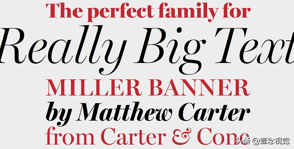 Miller Banner是一款经典的字体,广受人们欢迎,该字体是由Richard Lipton改编自Matthew Carter的热门美剧《米勒》的宣传字体。它有锋利的线条感和非常戏剧性的笔画对比,非常适合在文章标题中使用。