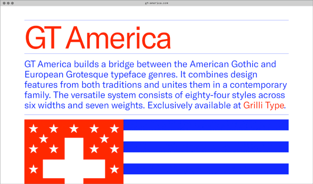 由NoëlLeu和Seb McLauchlan设计的GT America,本质上是延续了19世纪美国哥特式和20世纪欧洲新哥特式字体的风格。它提供84种样式,在字型宽度和字重上融合了两种传统设计元素,并将此特点发挥到极致。