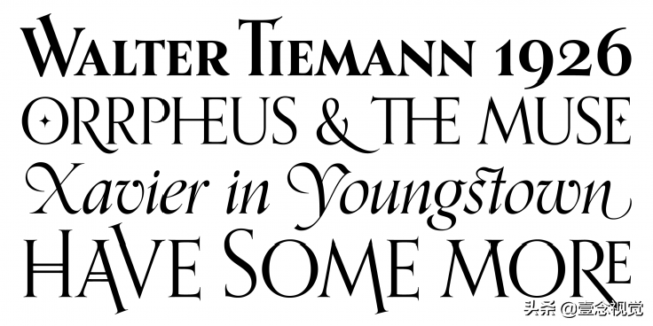 Orpheus字体灵感受到Walter Tiemann在1928年设计的两种衬线字体的启发,该字体在包装和娱乐设计中很受欢迎。受手写体的影响,它的斜体设计将古典罗马美学风格与装饰艺术结合在一起,拥有别具一格的视觉效果。