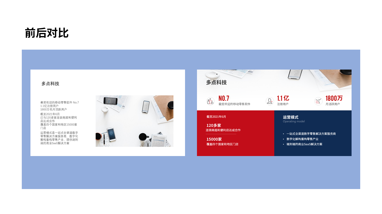 字体: 文字内容用的思源黑体系列,数字用的BEBAS字体;主题色是红色和蓝色;背景色纯白色;形状是矩形;修饰的元素是网上找的小图标和图片。