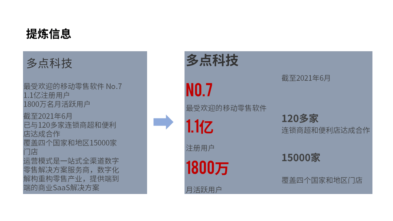 文字内容的提炼核心思想就是把重要的部分凸显出来,让人一眼就能看到重点。首先将整个页面的内容进行划分,具体将的哪些方面。然后凸显重点,数字和标题肯定是要重点突出的,可以通过改变字体字号颜色来实现,最后将相关联的内容放在一起呈现,参考如下: