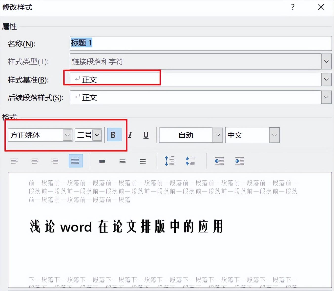 这里还需要注意的是,把【论文正文】样式新建好后,我们还需要把使用到的标题类样式的【后续段落样式】更改为【论文正文】,这样在标题回车后,就自动切换为论文正文的样式了。