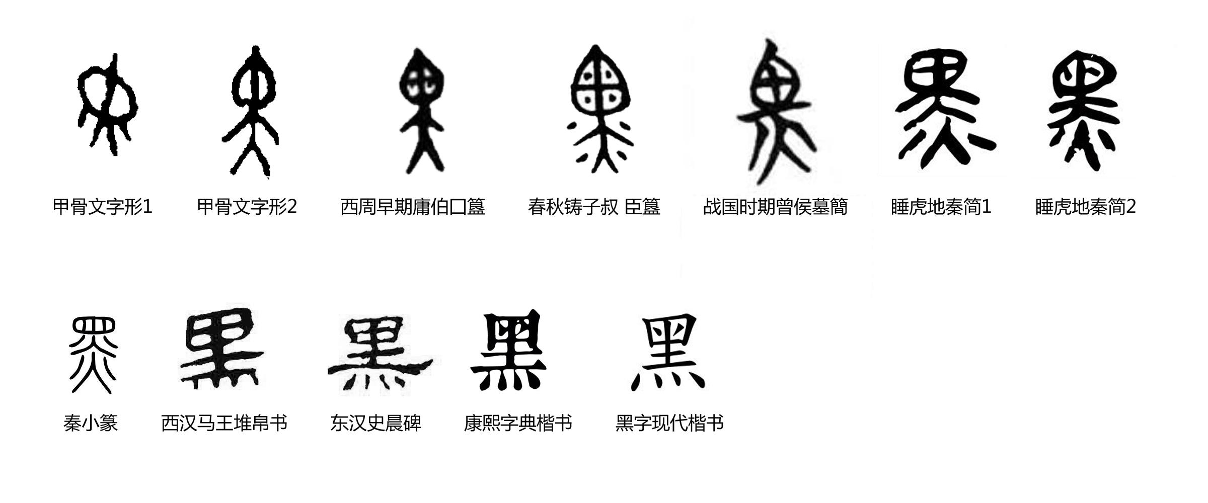 总之,从黑字演变过程,我们可以看到,华夏先民最初以闭眼看不见来表示光线不足昏暗的概念。但此字形后人没有被正确理解,于是逐渐演变为炊具被烟熏的样子来表示一种物质的颜色。换言之,黑字从人闭眼的主观感受,演变为客观事物的颜色。