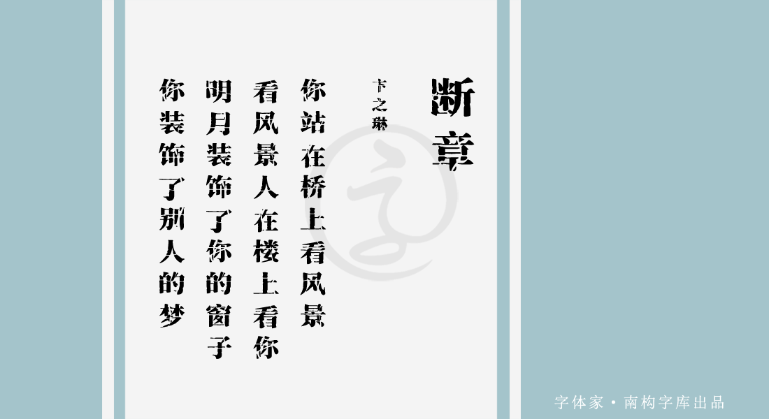 杭州贤书阁文化推出新的“南构字库”字体品牌。南构字库品牌是一个崭新的字库体系,目的是搭建一个良好的字库开放平台,吸引更多的字体爱好者和设计师加入,共同打造字库新生力量,为中国字体事业增添新鲜血液,南构字库主要将会开发出风格类、内文类、标题类字体,定位手写体和美术风格字体等,将与更多的字体作者、书法家共同达成良好的合作业界生态。