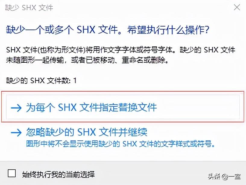 想要解决这个问题,有几个方法。首先就是可以选择安装缺少的字体。点击“为每个SHX文件指定替换文件”,在弹出的对话框中就可以看到你缺少的字体,可以在网络上找到字体并下载安装。