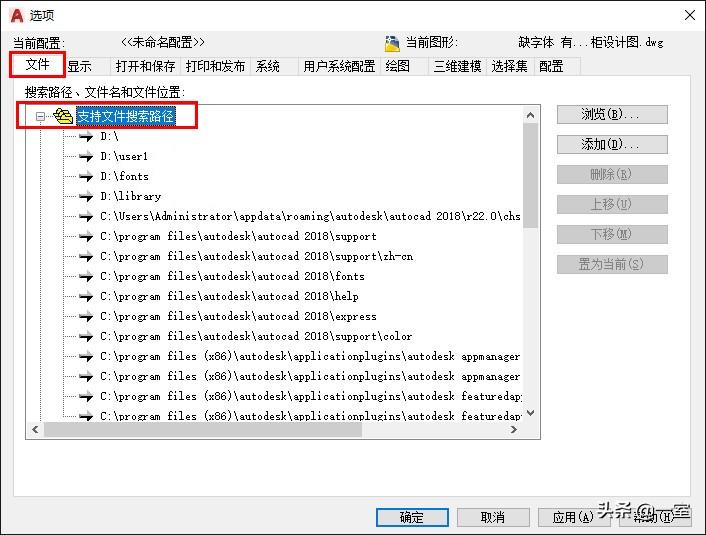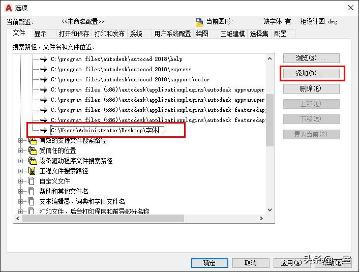 如果字体太多,或者不想复制,也可以这样做。复制你存放字体的文件夹的路径,进入CAD,输入命令OP,选择“文件”,点击“支持文件搜索路径”,添加一个,将刚刚复制的路径粘贴进去即可。