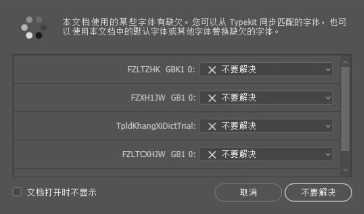 这是PS字体库内缺少该PSD内用到的字体的缘故。省事的话通常会选择忽略或用默认的字体替换之,反正影响也不大……