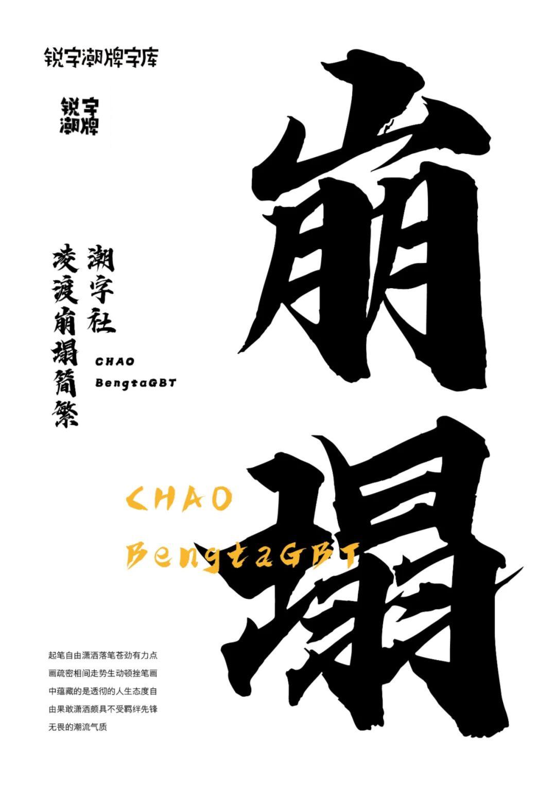 凌渡崩塌体 ,是基于传统书法为参考的创新手写体。设计师凌渡尊重传统、敬畏传统,并在此基础上与当下时尚潮流相结合,以一种全新的形态来展现汉字艺术的样貌。