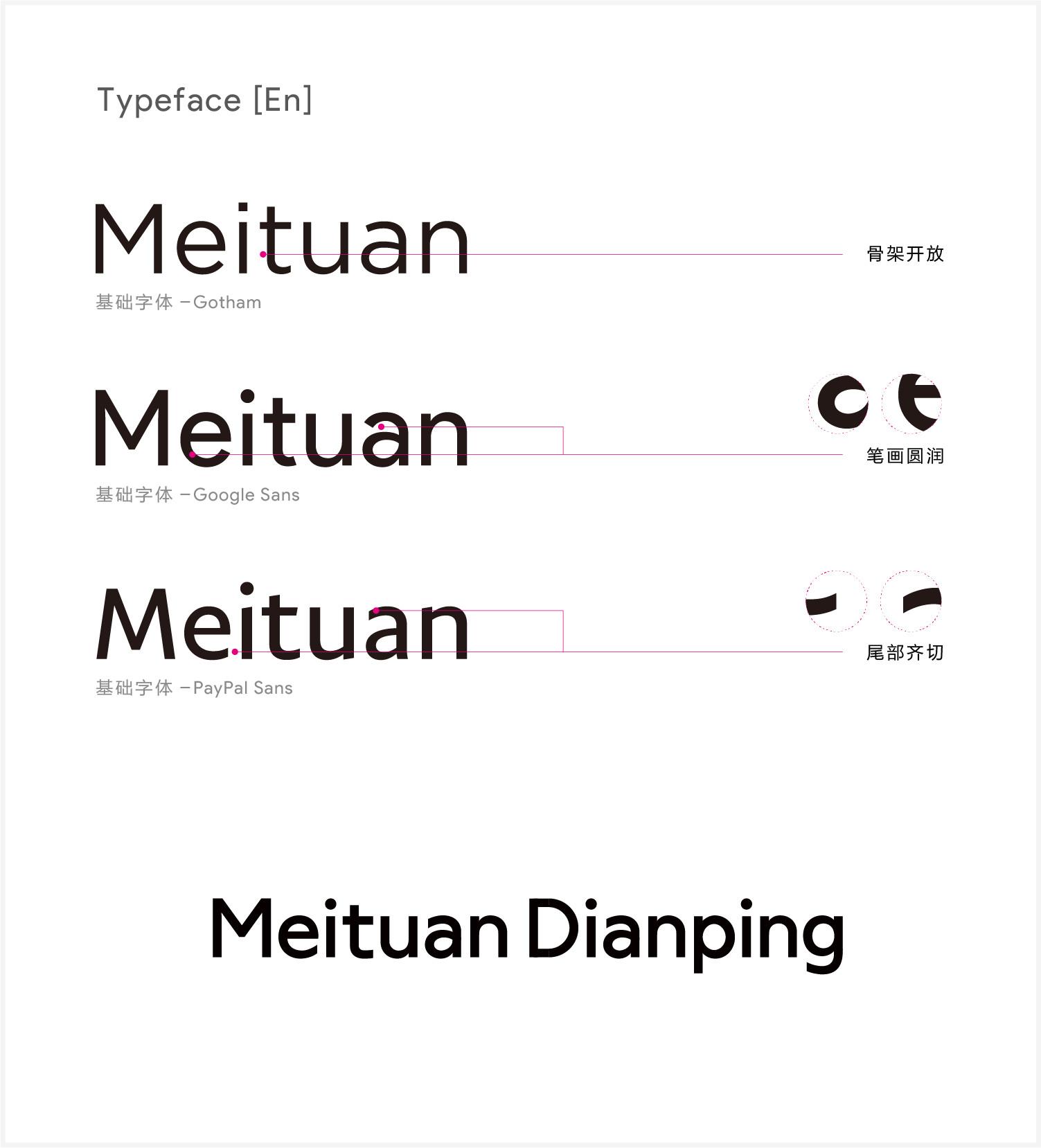 设计美团品牌字体的这个思路,源于我对重新设计“美团”二字时的思考结果。从品牌意义角度看,更新logo当中的字体,符合当下的设计趋势,对美团这一品牌来说是有正面效果但意义不大。更深层次,从企业价值角度看,仅靠两个设计后的字体很难为企业提供更多价值。那么在视觉层面(除颜色、插画等元素之外)加强用户对品牌的认知,是我的另一个思考方向。随着美团的业务范围不断扩大,品牌特征线下以餐饮、住宿、景区、交通等场景出现,并结合线上的发展需要,于是我有了一个想法——设计一款美团专属的品牌字体,专属品牌字体系统的存在,可以贯穿线上线下渠道,从视觉层面反映企业品牌特征的方式之一。随后也将这一想法发反应给了上司,很幸运得到了他们的认可与支持。