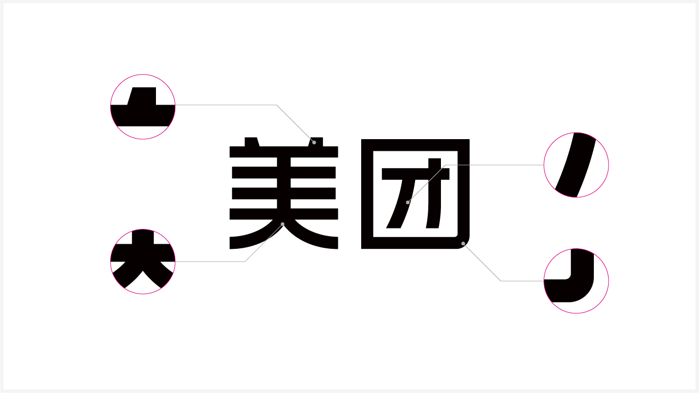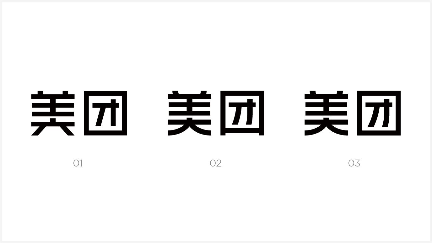 在第一个方案中美笔画过于夸张,降低了字体的识别和稳重感;第二个则是团字的下半部笔画的露出,造成细节增多,在缩小识别后会有一大一小的错觉;而第三个在识别中存在的问题不是很大,但笔画的形式上还可以进一步优化。经过反复推销和细节的调整,得出现在所使用的美团二字风格: