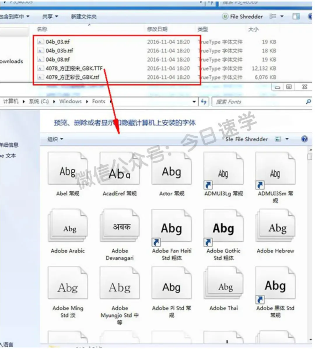 2、打开系统字体库,目录为C:\Windows\Fonts,将复制好的字体文件粘贴到系统字体库中。