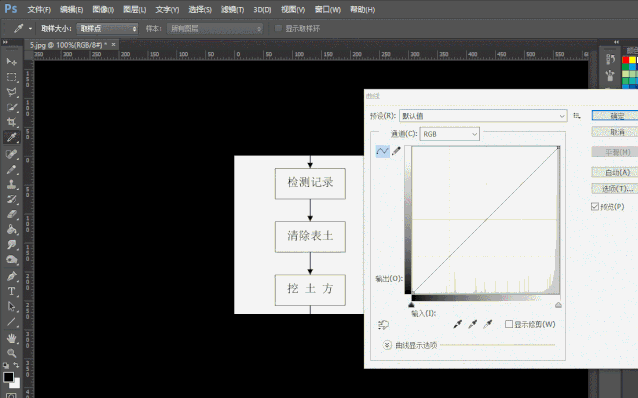 第三步 :调节图像曲线(CMYK模式图片,一般向左上角拉曲线,RGB一般向右下拉曲线,我这块是RGB模式)