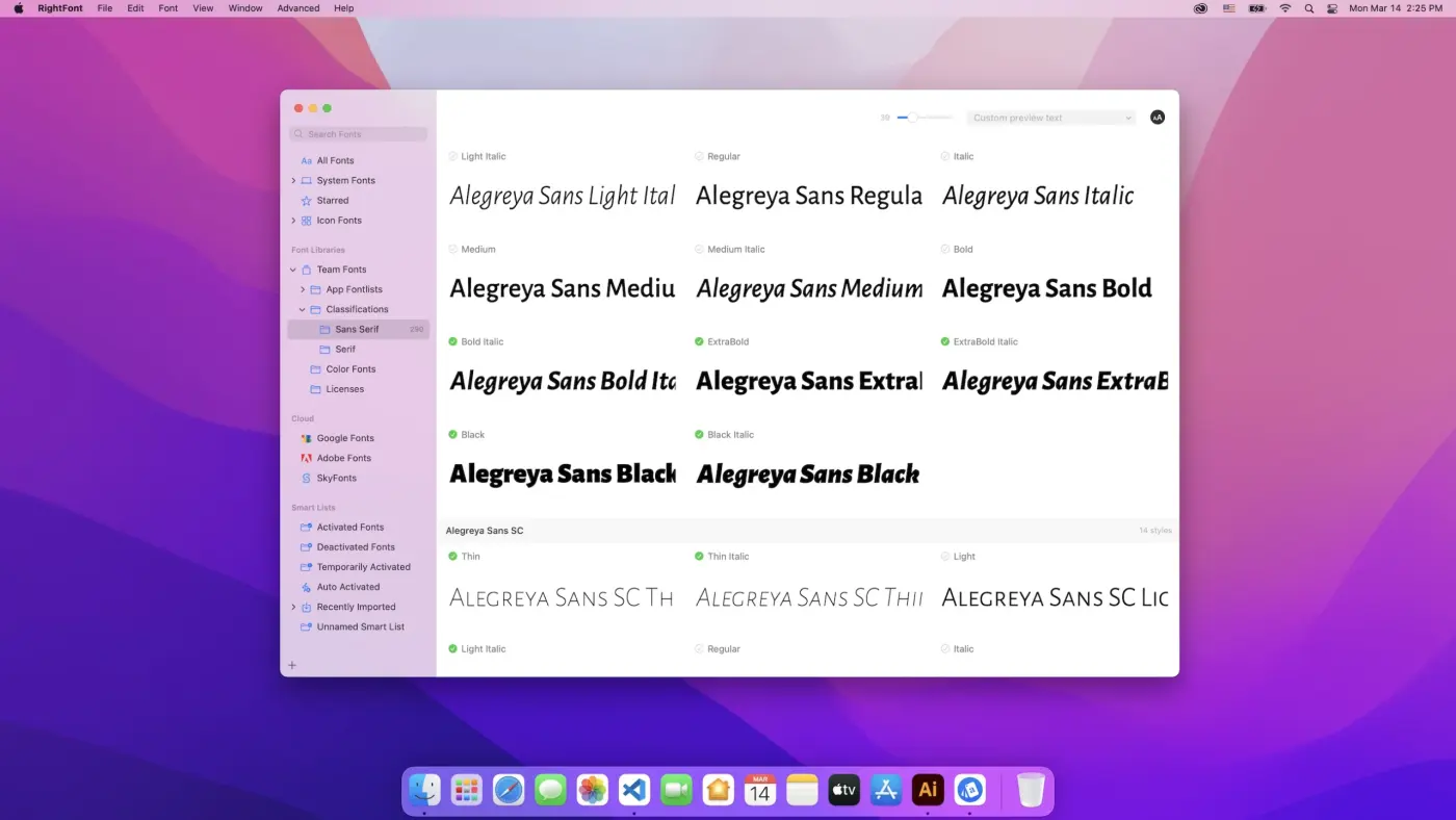 FontExpert 2021: US $49/ 一个序列号(公司用户:1 个序列号 = 绑定 1 台计算机,个人用户:1 个序列号 = 绑定2 台计算机)RightFont 是一款 macOS 设计的字体管理软件,可帮助设计师通过 Dropbox、Google Drive 预览、安装、同步和管理字体文件。