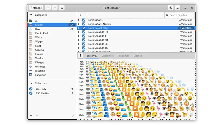 虽然设计时主要使用 Gnome 桌面环境,但它也可以与其他 Gtk 桌面环境一起使用,你可以按不同的类别或集合来管理字体。