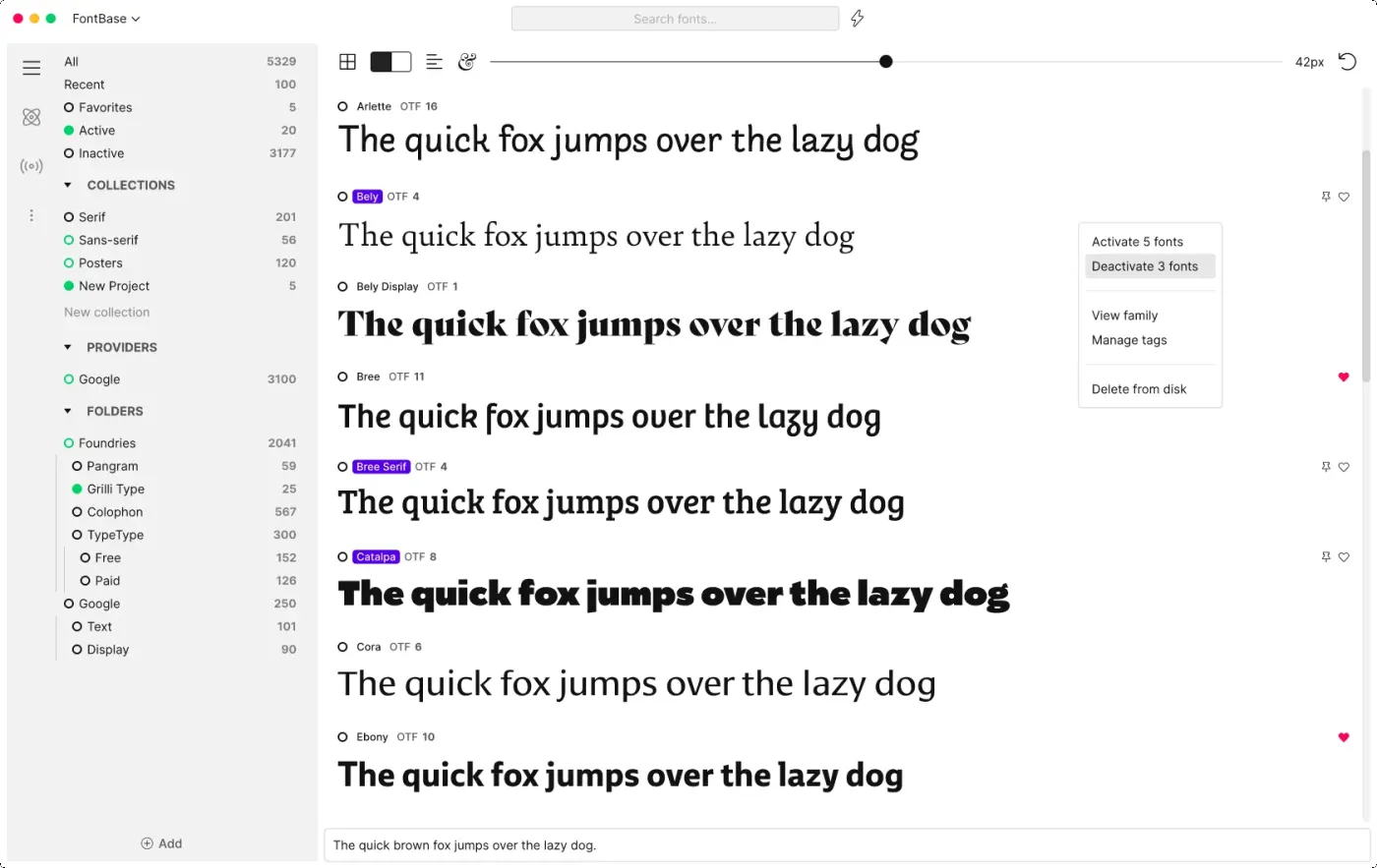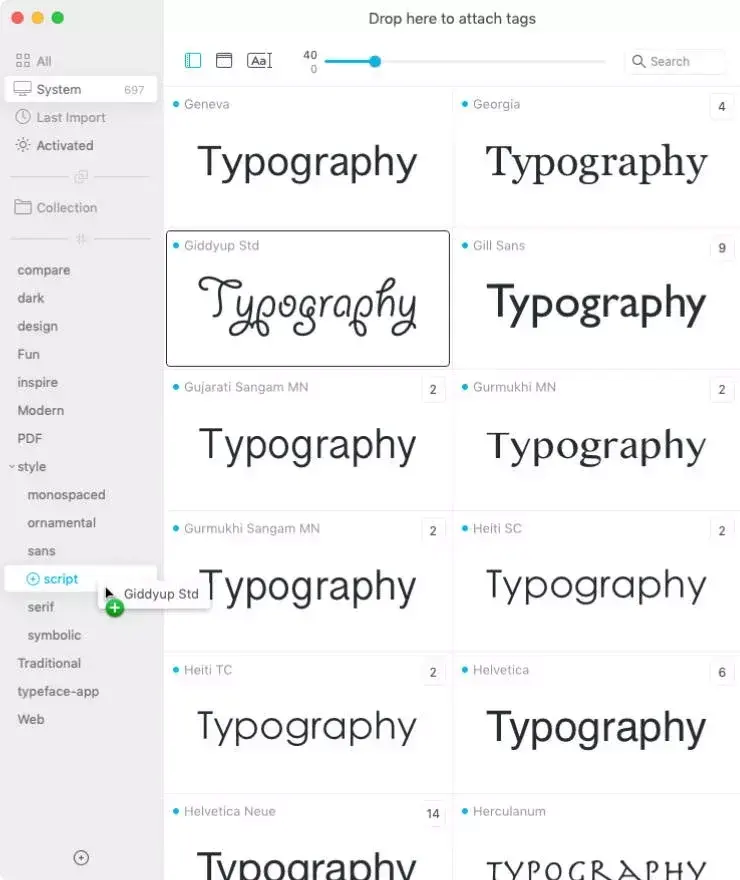 TypeFace 3 中的字体可以手动激活和停用,你还可以比较字体以区分相似字体之间的细微差别,它有一个标记系统来管理你的字体资源。