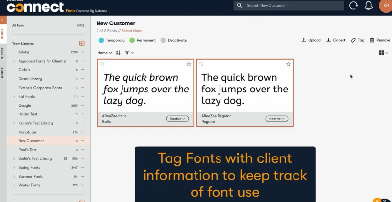 自动字体配对建议能在 Adobe Creative Cloud 和 Sketch 中的自动激活字体使用云端与你的团队成员共享字体移除损坏和重复的字体支持的操作系统: Web、macOS 和 Windows