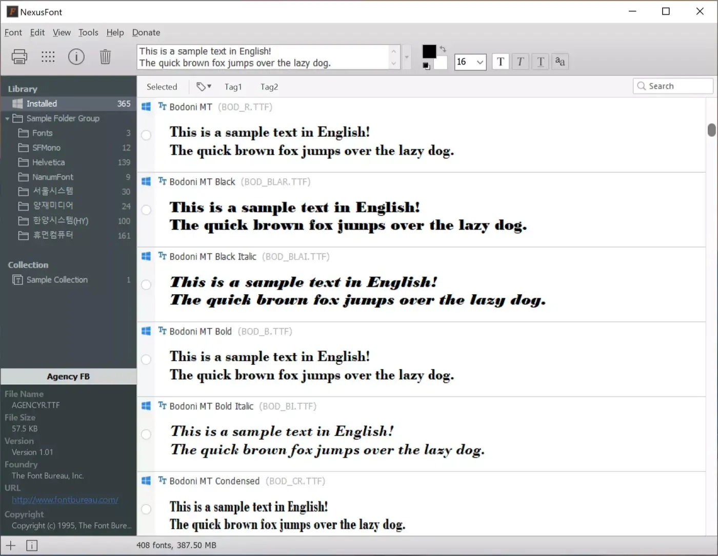 Nexusfont 是一款免费的 Windows 字体管理软件,你可以以个人身份或公司身份使用,无需支付任何费用。通过它,你可以管理、比较、选择字体,无需要将所有字体安装到系统中,只需要加载你需要使用的字体就好了,也可以对字体进行简单的标签分类。