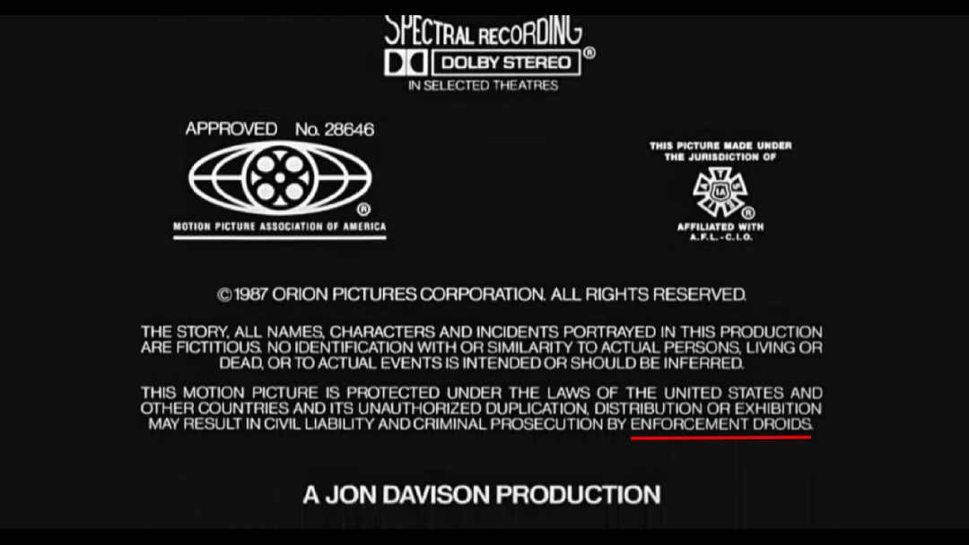 “本片受美国及其他国家法律保护……违法行为将被执法机器人逮捕”,而“执法机器人”(enforcement droids)就是影片中的机械战警的原型,刚刚看完影片的观众自然不会忘记。