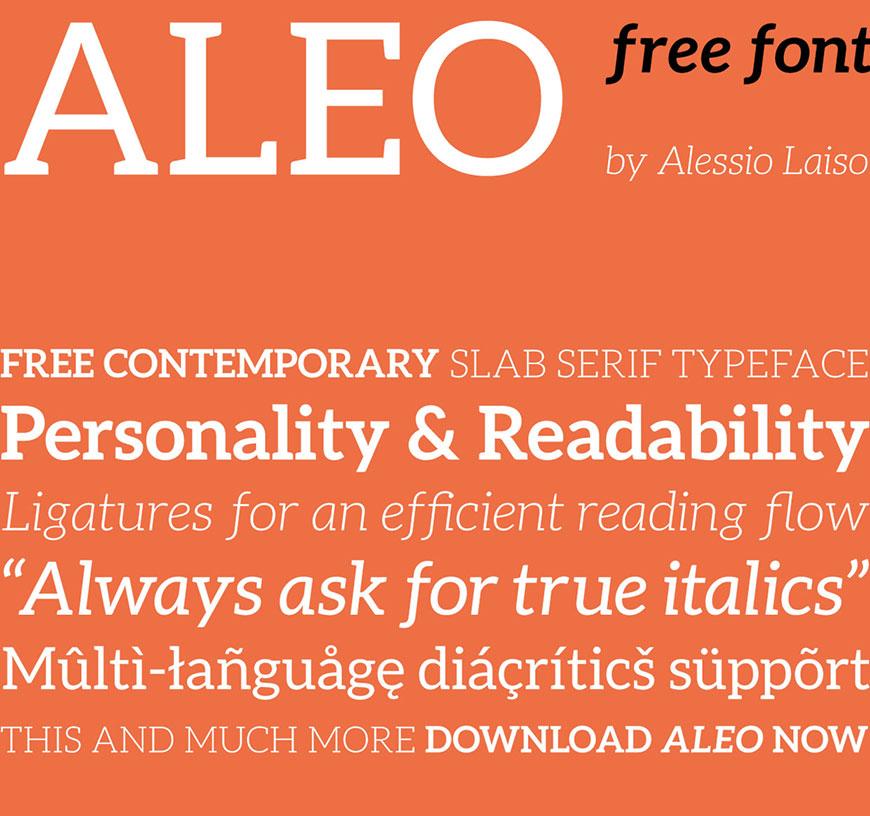 Aleo 是一款平板系列设计,边缘稍圆、外观友好,易于使用,可读性强。该字体有三种字重-细,常规,粗体以及相对应的斜体。Aleo 非常适合制作网站、手册和其他宣传材料。该字体是由都柏林的 Alessio Laiso 设计的。Aleo提供给个人或是商业用途免费使用。