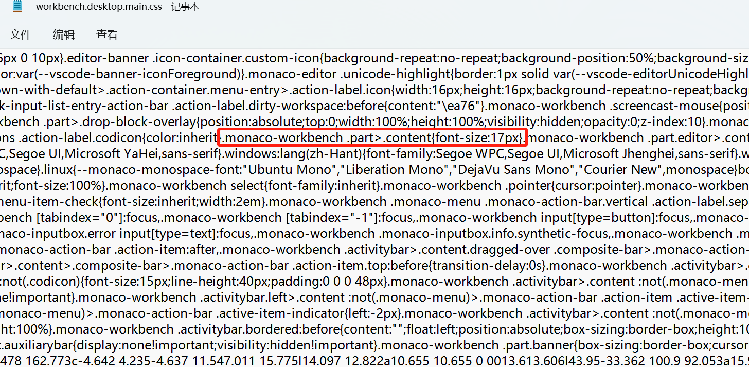 找到:monaco-workbench .part>.content{font-size:13px},修改: