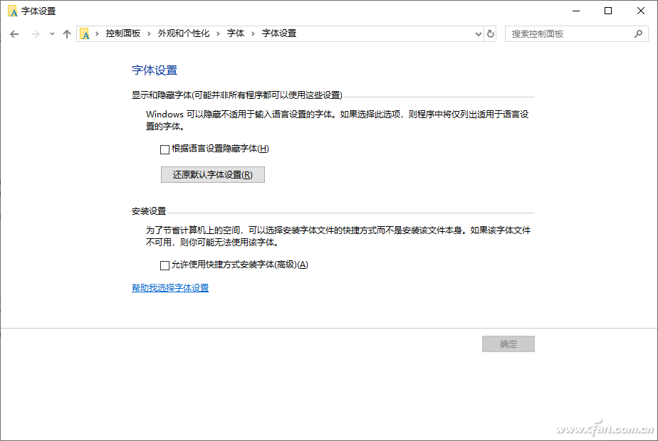 当我们遇到系统字体故障,比如使用第三方主题导致字体显示错误时,可以重置字体组件,快速恢复到系统原来的默认字体。在Windows 10中,依次打开“控制面板→外观和个性化→字体”,点击“更改字体设置”,接着在打开的窗口中点击“还原默认字体设置”,即可将系统字体恢复到初始状态(图1)。