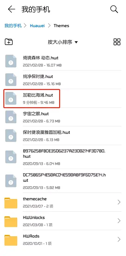 6、确认Themes文件夹是否有加勒比海滩.hwt文件。方法如下:在文件管理工具-浏览选项卡-我的手机-huawei文件夹-Themes文件夹-查找文件是否在。