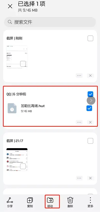 4、打开手机自带的“文件管理”工具,点开“最近”选项卡,查看最上面有一条:“qq5分钟前发送的文件”,可以看到正好是我们需要的加勒比海滩.hwt文件。