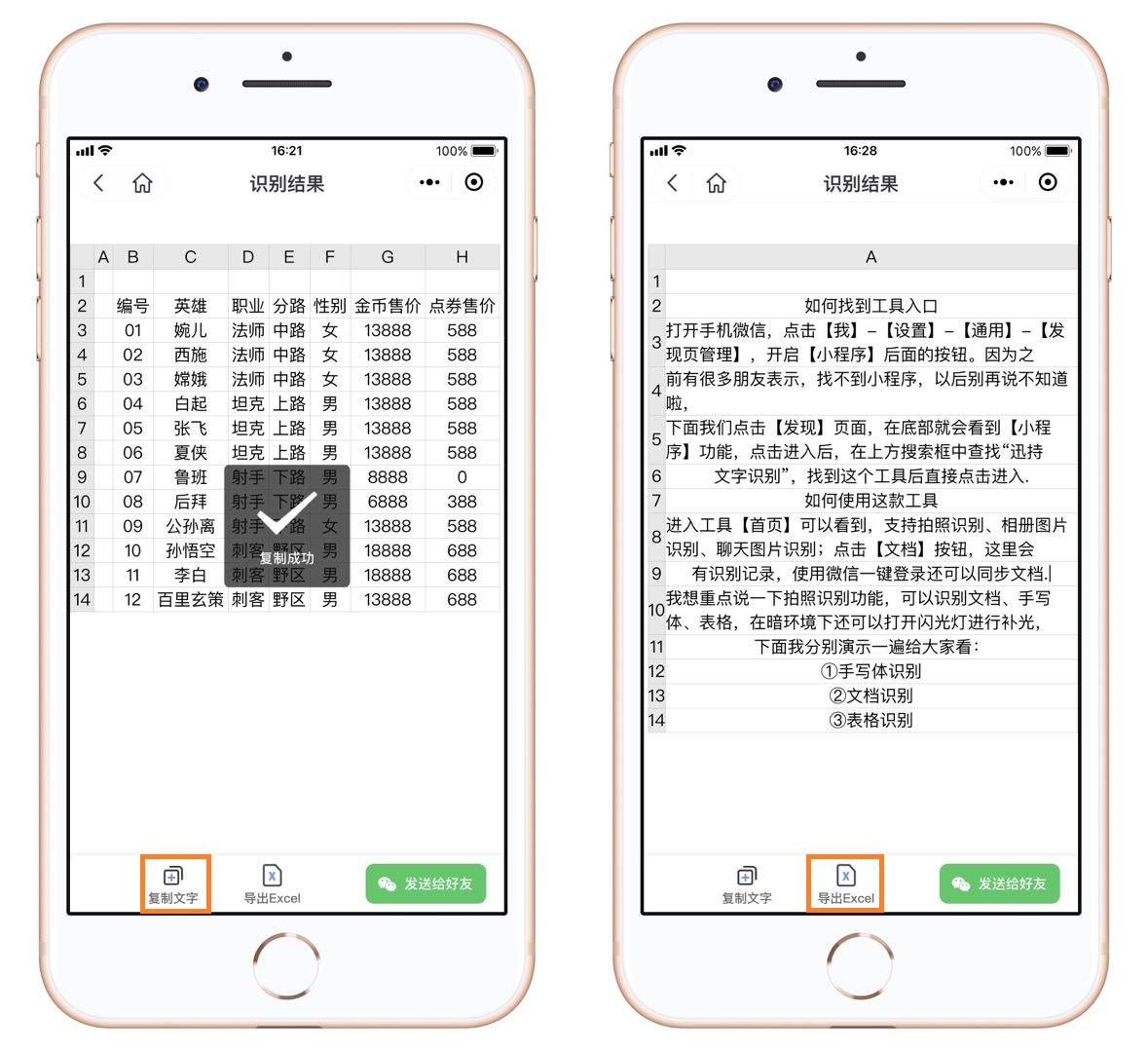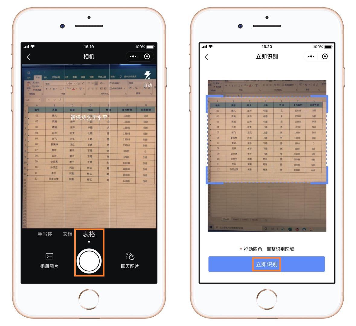 最后再看一下【表格】识别,对准一份表格内容将它拍下来,点击【立即识别】,或者对准文本拍照都可以。
