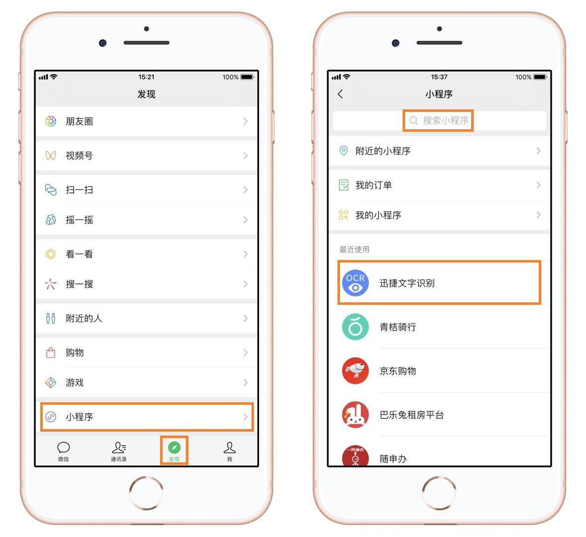 下面我们点击【发现】页面,在底部就会看到【小程序】功能,点击进入后,在上方搜索框中查找“迅捷文字识别 ”,找到这个工具后直接点击进入。