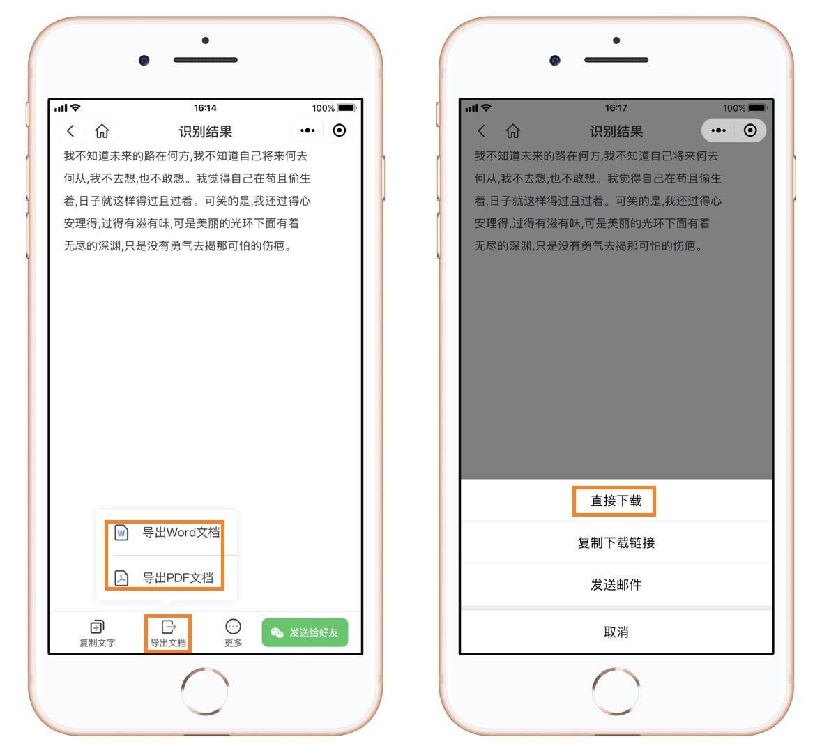 当识别结果出来后,点击【复制文字】提取纸上文本,你也可以选择【导出文档】,支持导出Word文档 和PDF文档 。